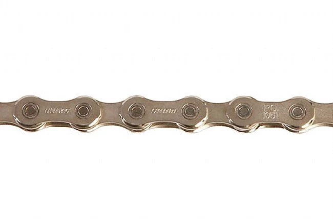 The SRAM PC-1051 chain features a slight re-shaping of the outer plates to run more quietly than the previous PC-1050 chain. Nickel plating is used on the outer and inner plates to resist corrosion. Solid chrome hardened pins. Includes tool-free PowerLock connector link. 271 grams (114 links).